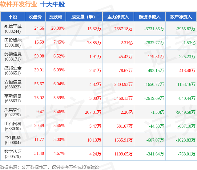 个股表现方面,软件开发行业当日领涨股为永信至诚(688244),该股当日报收24.66,上涨20.0%,成交量15.32万,主力资金净流入7687.18万元。国投智能(300188)以上涨7.45%紧随其后,该股当日成交量78.85万,主力资金净流入2.31亿元。除此之外,纬德信息(688171)、盛邦安全(688651)、安恒信息(688023)均进入当日牛股之列。具体个股列表见下表: