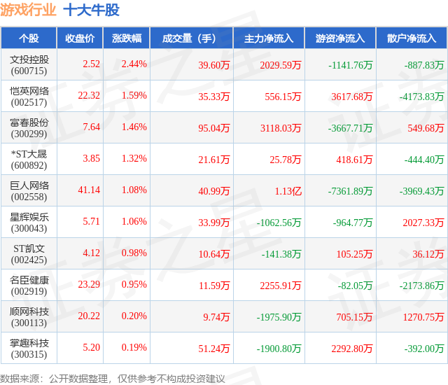 个股表现方面,游戏行业当日领涨股为文投控股(600715),该股当日报收2.52,上涨2.44%,成交量39.6万,主力资金净流入2029.59万元。恺英网络(002517)以上涨1.59%紧随其后,该股当日成交量35.33万,主力资金净流入556.15万元。除此之外,富春股份(300299)、*ST大晟(600892)、巨人网络(002558)均进入当日牛股之列。具体个股列表见下表: