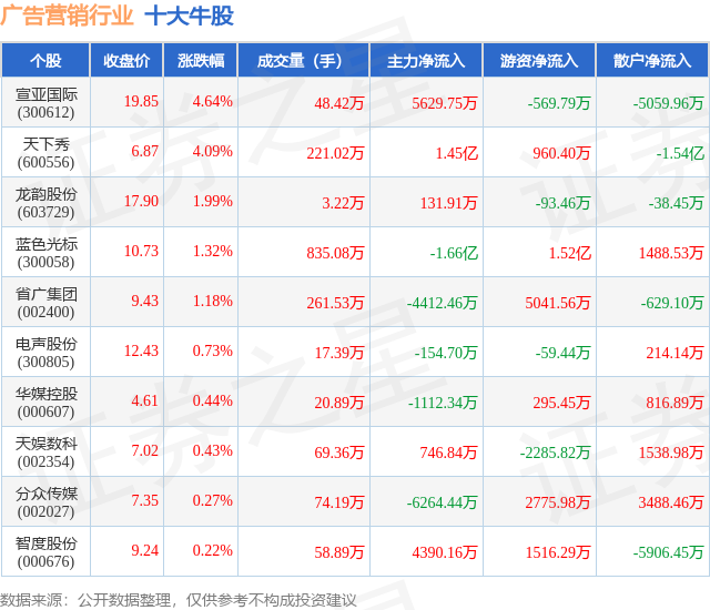 个股表现方面,广告营销行业当日领涨股为宣亚国际(300612),该股当日报收19.85,上涨4.64%,成交量48.42万,主力资金净流入5629.75万元。天下秀(600556)以上涨4.09%紧随其后,该股当日成交量221.02万,主力资金净流入1.45亿元。除此之外,龙韵股份(603729)、蓝色光标(300058)、省广集团(002400)均进入当日牛股之列。具体个股列表见下表: