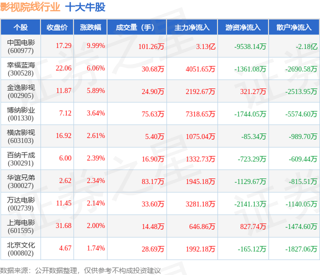 个股表现方面,影视院线行业当日领涨股为中国电影(600977),该股当日报收17.29,上涨9.99%,成交量101.26万,主力资金净流入3.13亿元。幸福蓝海(300528)以上涨6.06%紧随其后,该股当日成交量30.68万,主力资金净流入4051.65万元。除此之外,金逸影视(002905)、博纳影业(001330)、横店影视(603103)均进入当日牛股之列。具体个股列表见下表: