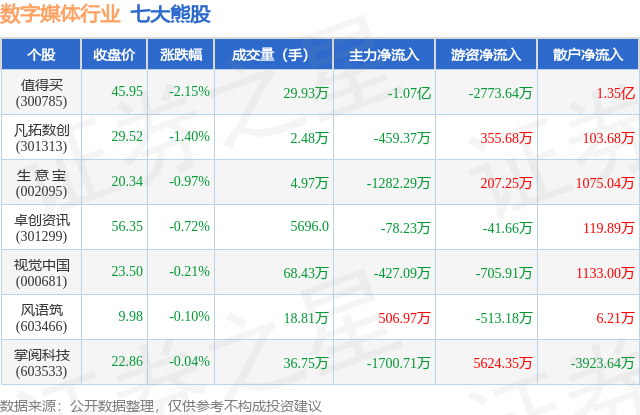 个股表现方面,数字媒体行业当日领跌股为值得买(300785),该股当日报收45.95,下跌2.15%,成交量29.93万,主力资金净流出1.07亿元。凡拓数创(301313)以下跌1.4%紧随其后,该股当日成交量2.48万,主力资金净流出459.37万元。除此之外,生 意 宝(002095)、卓创资讯(301299)、视觉中国(000681)均进入当日熊股之列。具体个股列表见下表: