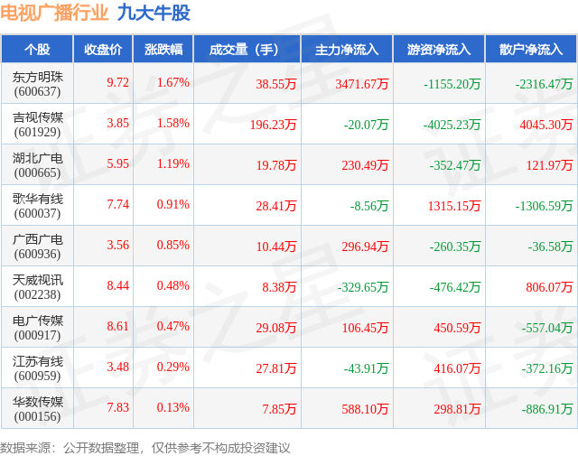 个股表现方面,电视广播行业当日领涨股为东方明珠(600637),该股当日报收9.72,上涨1.67%,成交量38.55万,主力资金净流入3471.67万元。吉视传媒(601929)以上涨1.58%紧随其后,该股当日成交量196.23万,主力资金净流出20.07万元。除此之外,湖北广电(000665)、歌华有线(600037)、广西广电(600936)均进入当日牛股之列。具体个股列表见下表: