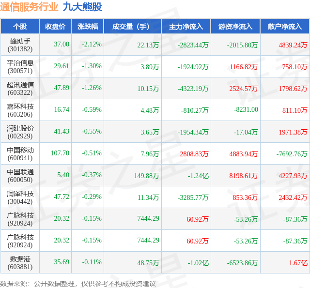 个股表现方面,通信服务行业当日领跌股为蜂助手(301382),该股当日报收37.0,下跌2.12%,成交量22.13万,主力资金净流出2823.44万元。平治信息(300571)以下跌1.3%紧随其后,该股当日成交量3.89万,主力资金净流出1924.92万元。除此之外,超讯通信(603322)、嘉环科技(603206)、润建股份(002929)均进入当日熊股之列。具体个股列表见下表: