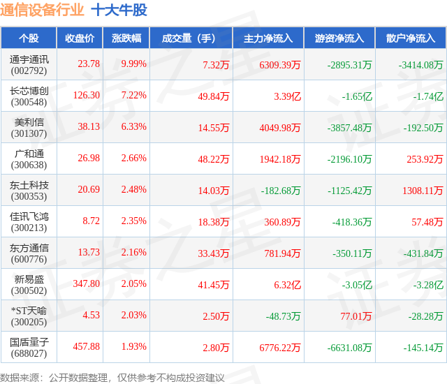 个股表现方面,通信设备行业当日领涨股为通宇通讯(002792),该股当日报收23.78,上涨9.99%,成交量7.32万,主力资金净流入6309.39万元。长芯博创(300548)以上涨7.22%紧随其后,该股当日成交量49.84万,主力资金净流入3.39亿元。除此之外,美利信(301307)、广和通(300638)、东土科技(300353)均进入当日牛股之列。具体个股列表见下表: