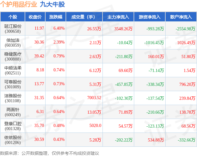 个股表现方面,个护用品行业当日领涨股为延江股份(300658),该股当日报收11.97,上涨6.4%,成交量26.55万,主力资金净流入3548.26万元。倍加洁(603059)以上涨2.39%紧随其后,该股当日成交量2.11万,主力资金净流出10.04万元。除此之外,稳健医疗(300888)、中顺洁柔(002511)、可靠股份(301009)均进入当日牛股之列。具体个股列表见下表:
