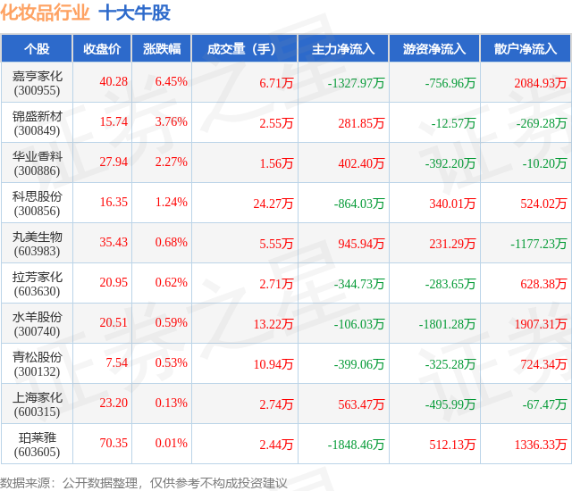 个股表现方面,化妆品行业当日领涨股为嘉亨家化(300955),该股当日报收40.28,上涨6.45%,成交量6.71万,主力资金净流出1327.97万元。锦盛新材(300849)以上涨3.76%紧随其后,该股当日成交量2.55万,主力资金净流入281.85万元。除此之外,华业香料(300886)、科思股份(300856)、丸美生物(603983)均进入当日牛股之列。具体个股列表见下表: