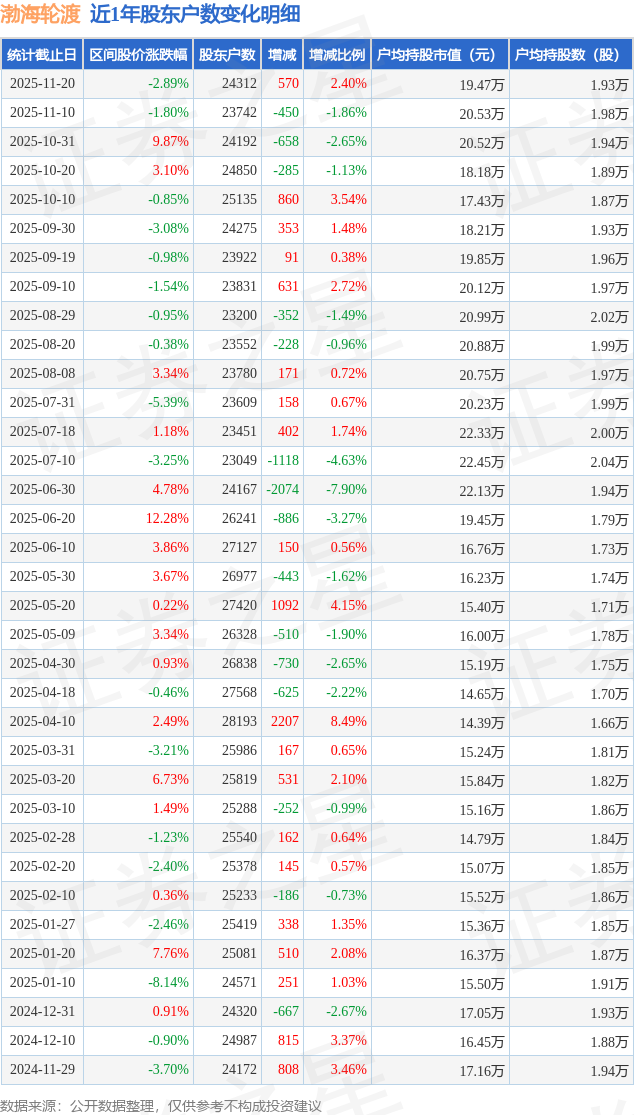 从股价来看,2025年11月10日至2025年11月20日,渤海轮渡区间跌幅为2.89%,在此期间股东户数增加570.0户,增幅为2.4%。
