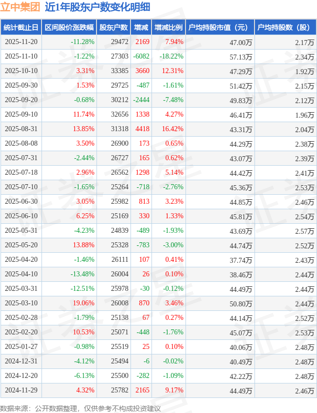 从股价来看,2025年11月10日至2025年11月20日,立中集团区间跌幅为11.28%,在此期间股东户数增加2169.0户,增幅为7.94%。
