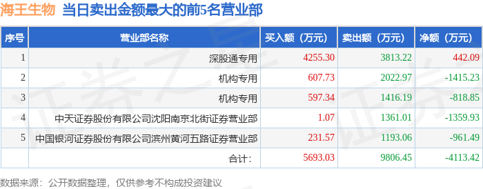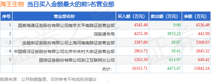 证券之星消息,沪深交易所2025年11月28日公布的交易公开信息显示,海王生物(000078)因日涨幅偏离值达到7%的前5只证券登上龙虎榜。此次是近5个交易日内第2次上榜。