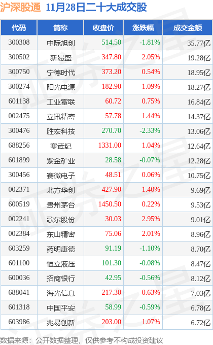 当日北向资金余额额度充足,茂业商业(600828)领涨,涨幅10.02%,交易所公布的沪深股通二十大成交股中成交额前三的为中际旭创、新易盛、宁德时代,成交额分别为35.77亿元、19.28亿元、18.95亿元。详情可见下表: