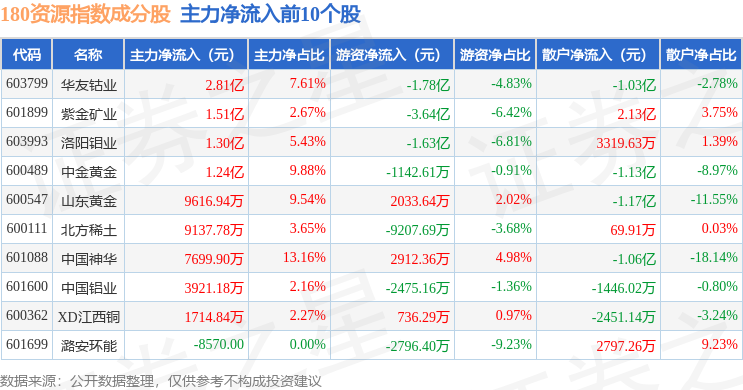 资金流向方面,180资源(000026)指数成份股当日主力资金净流入合计7.18亿元,游资资金净流出合计5.03亿元,散户资金净流出合计2.15亿元。成份股资金流向详情见下表: