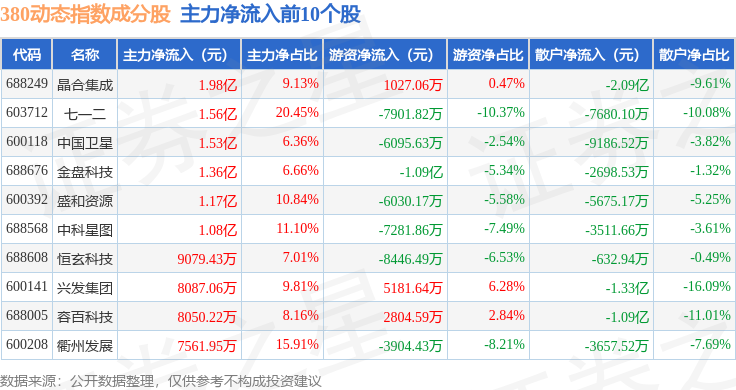 资金流向方面,380动态(000141)指数成份股当日主力资金净流入合计3.87亿元,游资资金净流出合计5.96亿元,散户资金净流入合计2.09亿元。成份股资金流向详情见下表: