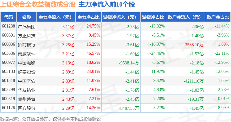 资金流向方面,上证综合全收益(000888)指数成份股当日主力资金净流入合计23.05亿元,游资资金净流出合计39.03亿元,散户资金净流入合计15.99亿元。成份股资金流向详情见下表: