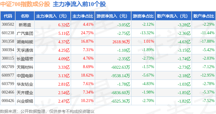 资金流向方面,中证700(000907)指数成份股当日主力资金净流入合计34.94亿元,游资资金净流出合计20.87亿元,散户资金净流出合计14.07亿元。成份股资金流向详情见下表: