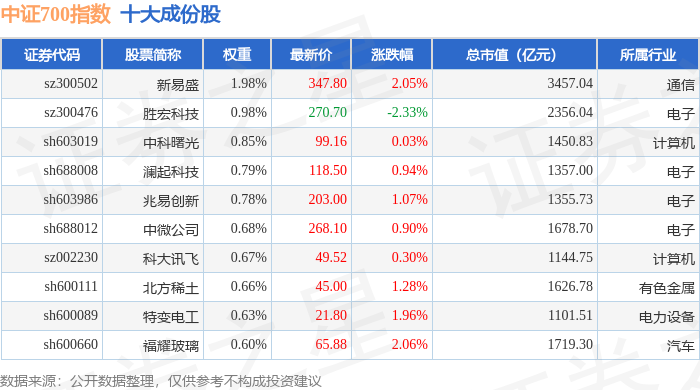 中证700(000907)指数十大成份股详情如下:
