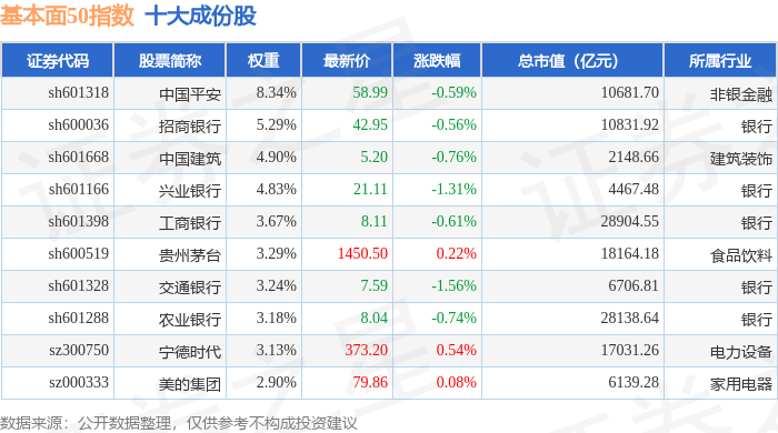 证券之星消息,11月28日,基本面50(000925)指数报收于4614.46点,跌0.45%,成交661.38亿元,换手率0.25%。当日该指数成份股中,上涨的有17家,中国电信以1.33%的涨幅领涨,下跌的有32家,邮储银行以1.9%的跌幅领跌。
