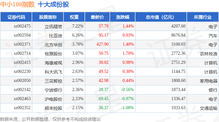 中小100(399005)指数十大成份股详情如下: