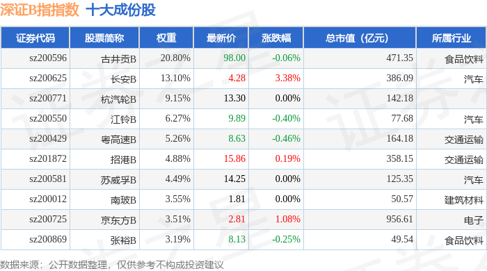 资金流向方面,深证B指(399108)指数成份股当日主力资金净流入合计97.92万元,游资资金净流出合计2.29万元,散户资金净流出合计95.63万元。成份股资金流向详情见下表: