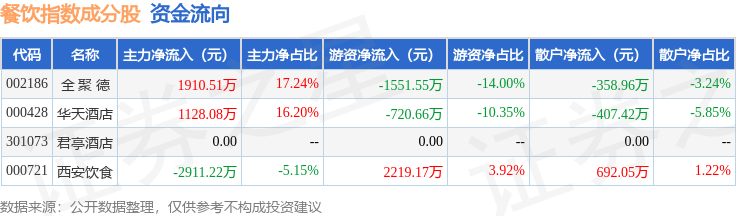 资金流向方面,餐饮指数(399238)成份股当日主力资金净流入合计127.38万元,游资资金净流出合计53.04万元,散户资金净流出合计74.34万元。成份股资金流向详情见下表: