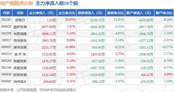 资金流向方面,地产指数(399241)成份股当日主力资金净流入合计1.31亿元,游资资金净流出合计2.26亿元,散户资金净流入合计9541.0万元。成份股资金流向详情见下表:
