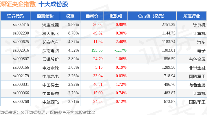 证券之星消息,11月28日,深证央企(399335)指数报收于4092.79点,涨0.55%,成交220.62亿元,换手率0.61%。当日该指数成份股中,上涨的有41家,钒钛股份以3.03%的涨幅领涨,下跌的有9家,招商蛇口以2.63%的跌幅领跌。