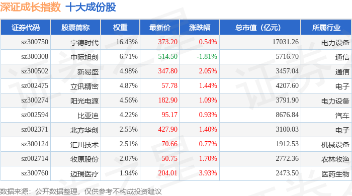 深证成长(399346)指数十大成份股详情如下: