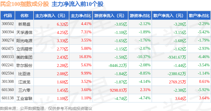 资金流向方面,民企100(399362)指数成份股当日主力资金净流出合计6.76亿元,游资资金净流出合计3.19亿元,散户资金净流入合计9.96亿元。成份股资金流向详情见下表: