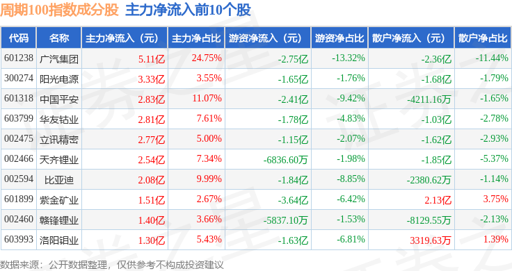 资金流向方面,周期100(399402)指数成份股当日主力资金净流入合计4.69亿元,游资资金净流出合计6.7亿元,散户资金净流入合计2.01亿元。成份股资金流向详情见下表: