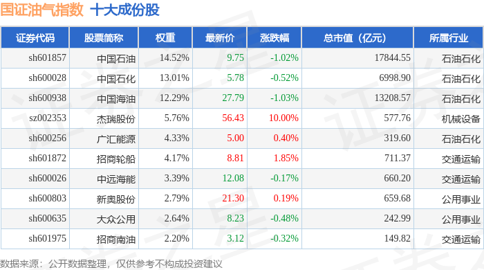 证券之星消息,11月28日,国证油气(399439)指数报收于1842.27点,涨0.81%,成交143.52亿元,换手率0.51%。当日该指数成份股中,上涨的有41家,厚普股份以11.62%的涨幅领涨,下跌的有9家,中曼石油以3.48%的跌幅领跌。