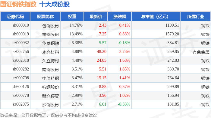 国证钢铁(399440)指数十大成份股详情如下:
