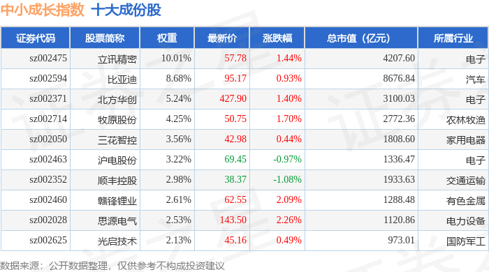 证券之星消息,11月28日,中小成长(399602)指数报收于1233.83点,涨1.22%,成交770.63亿元,换手率1.86%。当日该指数成份股中,上涨的有82家,杰瑞股份以10.0%的涨幅领涨,下跌的有18家,银轮股份以3.31%的跌幅领跌。