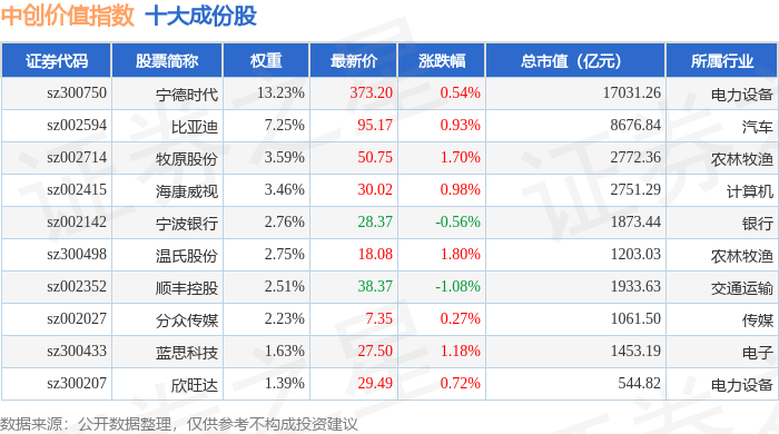 中创价值(399627)指数十大成份股详情如下: