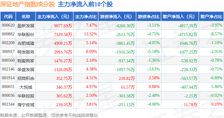 资金流向方面,深证地产(399637)指数成份股当日主力资金净流入合计4433.46万元,游资资金净流出合计8721.6万元,散户资金净流入合计4288.14万元。成份股资金流向详情见下表: