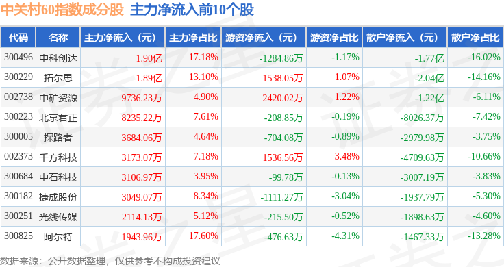 资金流向方面,中关村60(399697)指数成份股当日主力资金净流出合计5.97亿元,游资资金净流入合计1.62亿元,散户资金净流入合计4.35亿元。成份股资金流向详情见下表: