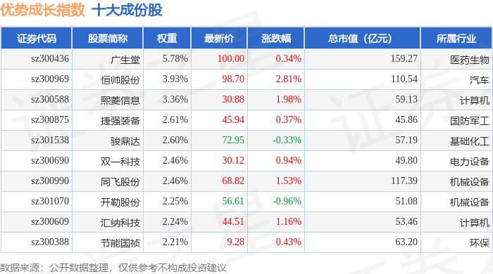 证券之星消息,11月28日,优势成长(399698)指数报收于52075.43点,涨1.27%,成交92.36亿元,换手率2.04%。当日该指数成份股中,上涨的有40家,招标股份以10.2%的涨幅领涨,下跌的有7家,零点有数以1.42%的跌幅领跌。