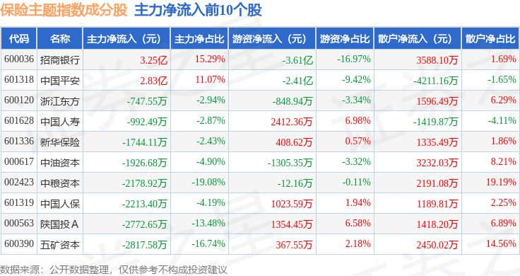 资金流向方面,保险主题(399809)指数成份股当日主力资金净流出合计3.86亿元,游资资金净流入合计1.86亿元,散户资金净流入合计2.0亿元。成份股资金流向详情见下表:
