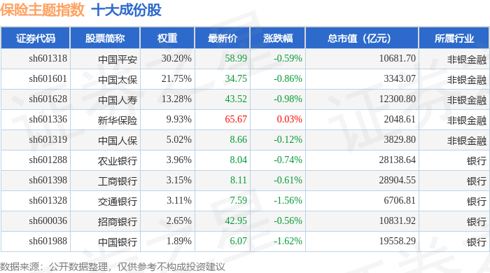 证券之星消息,11月28日,保险主题(399809)指数报收于2425.35点,跌0.66%,成交174.98亿元,换手率0.17%。当日该指数成份股中,上涨的有5家,中油资本以0.77%的涨幅领涨,下跌的有12家,中国银行以1.62%的跌幅领跌。