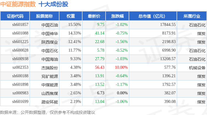 证券之星消息,11月28日,中证能源(399928)指数报收于2900.58点,跌0.1%,成交69.93亿元,换手率0.22%。当日该指数成份股中,上涨的有13家,杰瑞股份以10.0%的涨幅领涨,下跌的有10家,陕西煤业以1.56%的跌幅领跌。