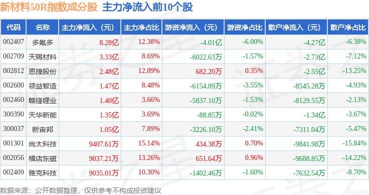 资金流向方面,新材料50R(470042)指数成份股当日主力资金净流入合计20.97亿元,游资资金净流出合计9.48亿元,散户资金净流出合计11.49亿元。成份股资金流向详情见下表: