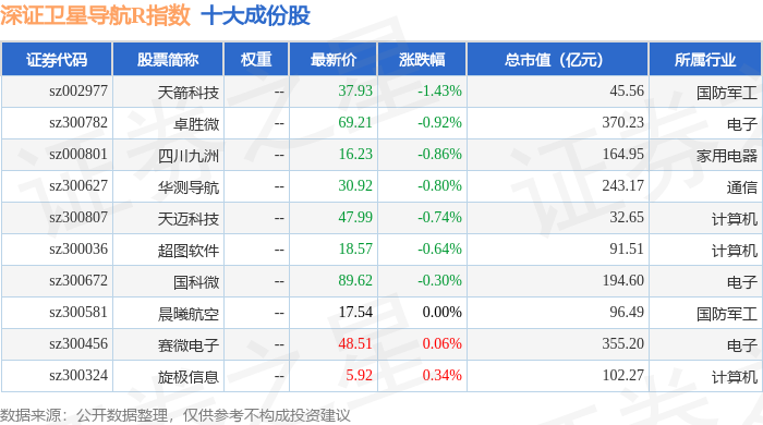 深证卫星导航R(470050)指数十大成份股详情如下: