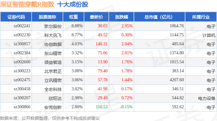 深证智能穿戴R(470074)指数十大成份股详情如下:
