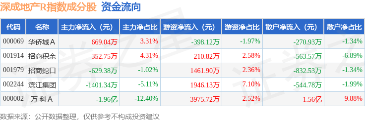 资金流向方面,深成地产R(471001)指数成份股当日主力资金净流出合计2.06亿元,游资资金净流入合计7196.45万元,散户资金净流入合计1.34亿元。成份股资金流向详情见下表: