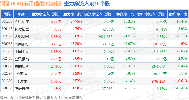 资金流向方面,湾创100R(港币)(480002)指数成份股当日主力资金净流入合计12.68亿元,游资资金净流出合计22.1亿元,散户资金净流入合计9.41亿元。成份股资金流向详情见下表: