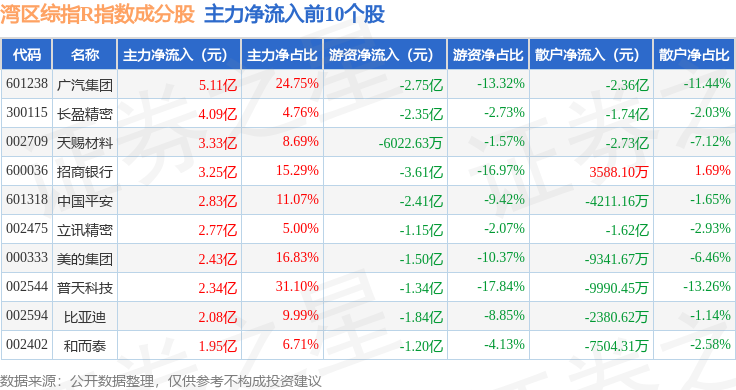 资金流向方面,湾区综指R(480003)指数成份股当日主力资金净流入合计11.9亿元,游资资金净流出合计26.38亿元,散户资金净流入合计14.43亿元。成份股资金流向详情见下表: