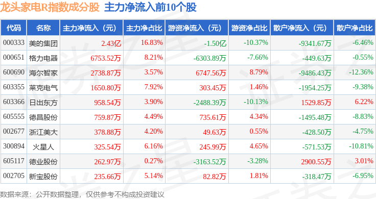 资金流向方面,龙头家电R(480028)指数成份股当日主力资金净流入合计2.23亿元,游资资金净流出合计1.81亿元,散户资金净流出合计4141.19万元。成份股资金流向详情见下表: