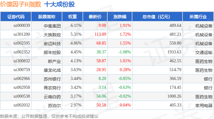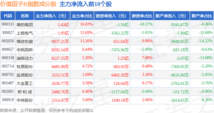 资金流向方面,价值因子R(480056)指数成份股当日主力资金净流入合计3.13亿元,游资资金净流入合计1.43亿元,散户资金净流出合计4.56亿元。成份股资金流向详情见下表: