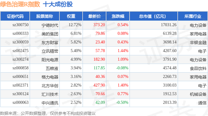 证券之星消息,11月28日,绿色治理R(480058)指数报收于1544.71点,涨0.67%,成交861.22亿元,换手率0.97%。当日该指数成份股中,上涨的有71家,杰瑞股份以10.0%的涨幅领涨,下跌的有28家,招商蛇口以2.63%的跌幅领跌。