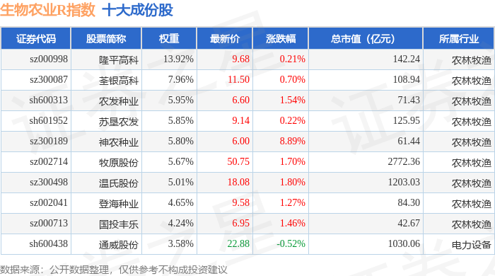 资金流向方面,生物农业R(480072)指数成份股当日主力资金净流入合计1.28亿元,游资资金净流出合计1.57亿元,散户资金净流入合计2685.18万元。成份股资金流向详情见下表: