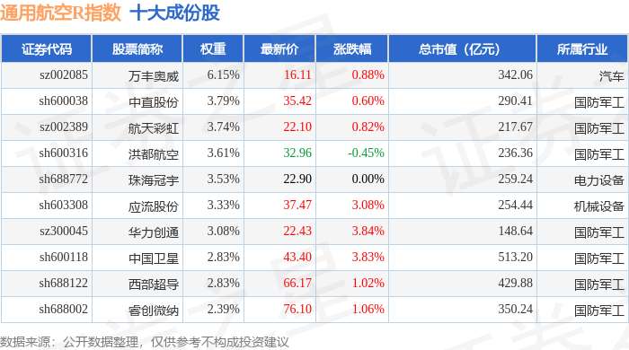 资金流向方面,通用航空R(480076)指数成份股当日主力资金净流入合计1.65亿元,游资资金净流出合计2.04亿元,散户资金净流入合计3883.11万元。成份股资金流向详情见下表: