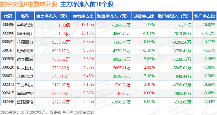 资金流向方面,数字交通R(480075)指数成份股当日主力资金净流入合计2.66亿元,游资资金净流出合计1.77亿元,散户资金净流出合计8912.61万元。成份股资金流向详情见下表: